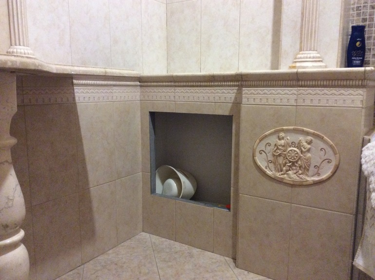 4. На последнем фото видно есть Ниша под сан узлы. Сначала хотела закрыть люком, но потом возник вопрос о месте хранения всяких шампуней и прочих мыльных принадлежностей. Так может эту нишу сделать открытой с полкой и оформить плиткой как всю ванную комнату.