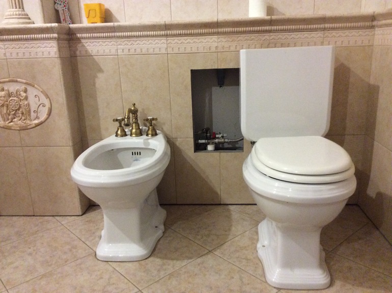 Имеем справа от входа унитаз, биде, далее угловая ванна, ну и слева от входа раковина с большим столом (2,10 см.) и зеркало (1,2*1,2) ( душевая не влезла).