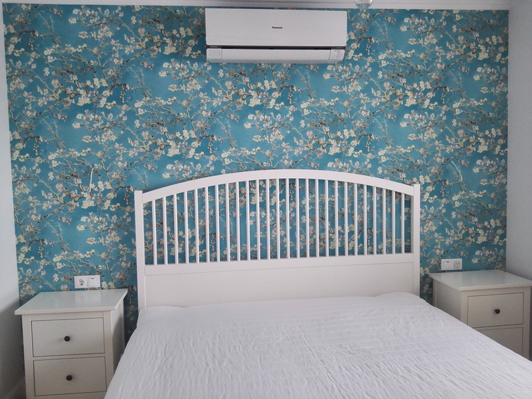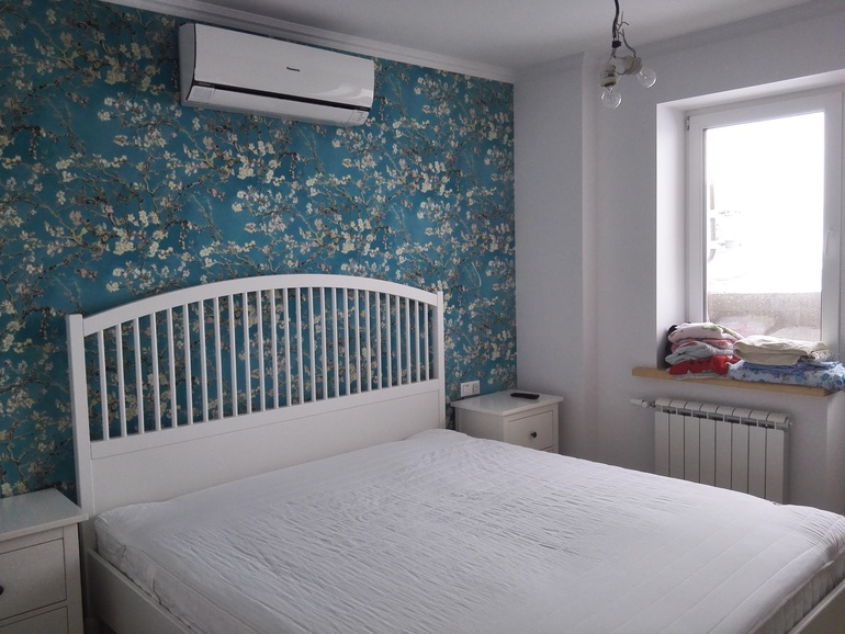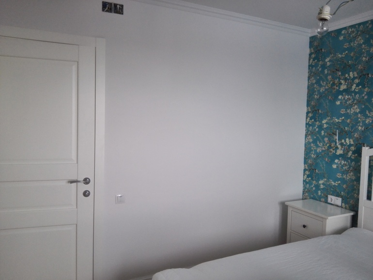 Интерьерное решение спальниИмеется маленькая спальня, стены белые, одна стена насыщенно-голубого цвета с рисунком. Подскажите, какие шторы повесить и как, до конца стены или нет? Еще что-то нужно сделать со стеной слева от кровати и где телевизор, они слишком пустые ( Девочки, помогите советом.