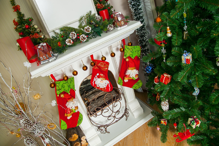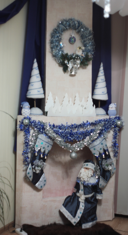 Этого конечно, я не ожидала совсем (к сожалению, с того года осталась только эта неудачная и плохого качества фотография)! Камин! Настоящий! С трубой! И с венком! И с сапогами!