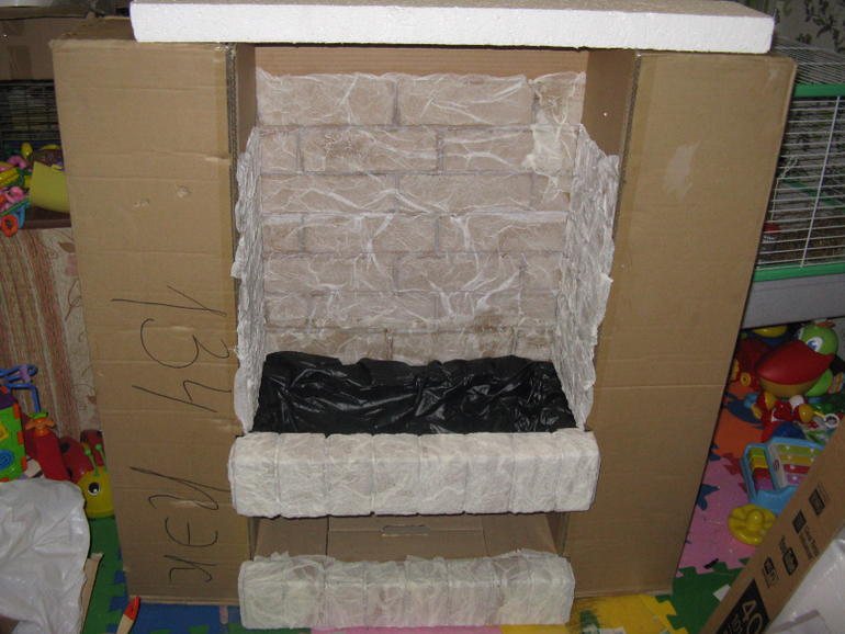 5. Мои коробочки, которые я не знаю откуда :) , были с одной стороны ровные, с другой с углублением (вы видели это на фото), нижнюю я положила ровной стороной вверх, а верхнюю, верх углублением. Это углубление я задекорировала черной тканью (вырезала прямоугольник, размером больше чем полочка и прикрепила края к наружным (которые не видно) стенкам полочки, а спереди прикрепила к внутренней стенке на двусторонний скотч (под кирпичики, поэтому делала их на сантиметр больше, как бы над углублением). Ещё я вырезала в одном боку этой коробки дырку, чтобы прошла розетка. Собираем наш камин (колонны, полочки, заднюю стенку) воедино. Приступаем к покраске кладки. Для этого нам нужна водоэмульсионная краска, колер (персиковый и черный). Наливаем в отдельную баночку краску и смешиваем с колерами (я налила почти полную жестяную баночку от кукурузы, туда вылили весь персиковый колер и примерно четверть черного) всё перемешиваем и красим наши кирпичи. Краска быстро высыхает, проверяем со всех сторон, полностью ли прокрашена кладка (мне пришлось подкрашивать раз 5 наверно). Кирпичи высохли, рисуем цемент (тоненькой кисточкой). Для этого смешиваем краску с черным колером, должен получиться тёмно-серый цвет.