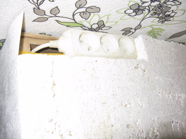 7. Вырезаем из пенопласта верхушку камина (хорошо вымеряем) и приклеиваем его на двусторонний и обычный скотч к колоннам. Я вырезала сначала в колонне, а потом в пенопласте углубление для удлинителя, т.к над камином мы повесим телевизор, и лишние провода испортят всю картину. Ещё я вырезала в нижнем углу колонны отверстие для протягивания удлинителя. Удлинитель протянула. Двусторонним скотчем проклеиваем швы и углы нашего камина (вместе с пенопластом). Обклеиваем камин обоями на двусторонний скотч. Я купила белые с небольшой фактурой, виниловые обои, они замечательно скрывают все неровности и небольшие погрешности.