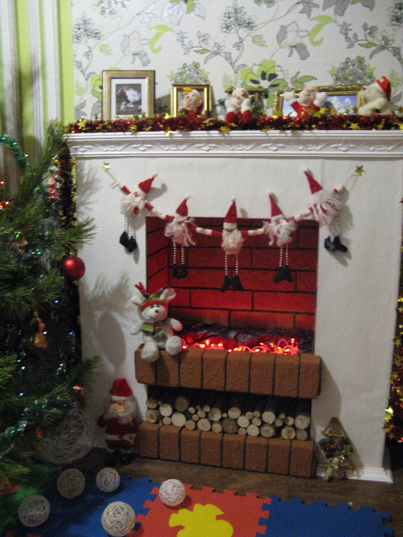 6. Верхнюю переднюю стенку вырезаем из картона (хорошо вымеряем расстояние и вырезаем картон на 5 см больше с обеих сторон, прорезаем в нужном месте картон и сгибаем, как делали кирпичи на полочку, получаем конструкцию похожую на букву П, следим, чтобы стенка была вровень с колоннами и приклеиваем к внутренним стенкам колонн на двусторонний скотч). На этом этапе укладываем гирлянду (покупаем обычную гирлянду, но только с красными лампочками) протягиваем вилку в отверстие, которое мы сделали в полочке и вытягиваем наверх колонны (тоже в отверстие).Теперь ставим наш камин на место, к стенке. Мне муж прикрепил камин к стенке на 2 шурупа (или как они называются с пластиковыми такими штучками, в которые вкручивается шуруп). Сейчас появятся небольшие щели из-за неровности пола, стенки или коробки :) если щель появилась внизу, то подложите небольшие полоски картона, позже эти погрешности видно не будет.
