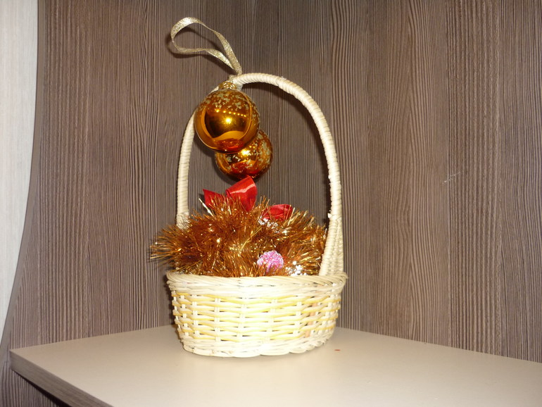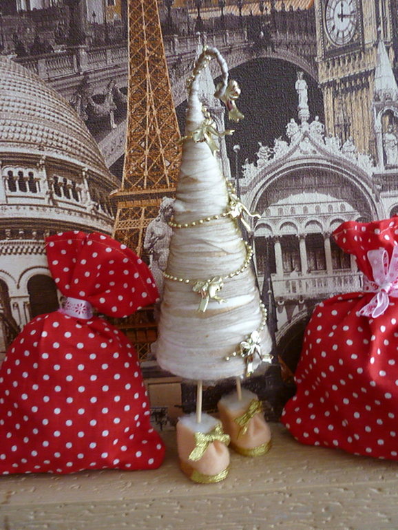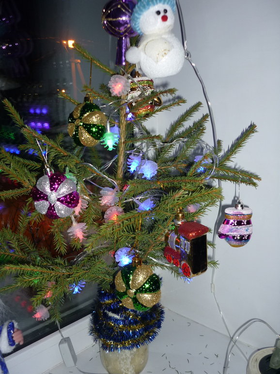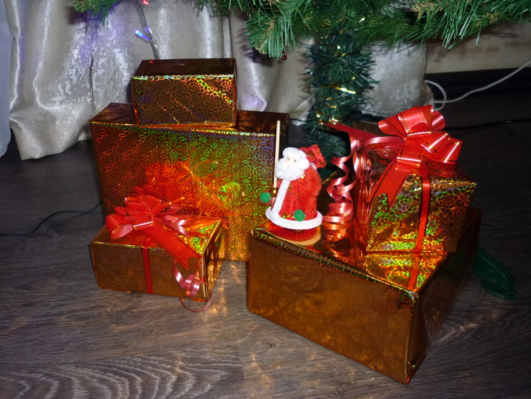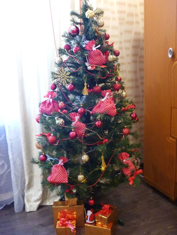В этом году наша красавица одета в красно-золотой наряд и бусы, позднее добавила мешочки. В них каждое утро дети находили киндер-сюрпризы. Под елкой подарки для родных и близких.