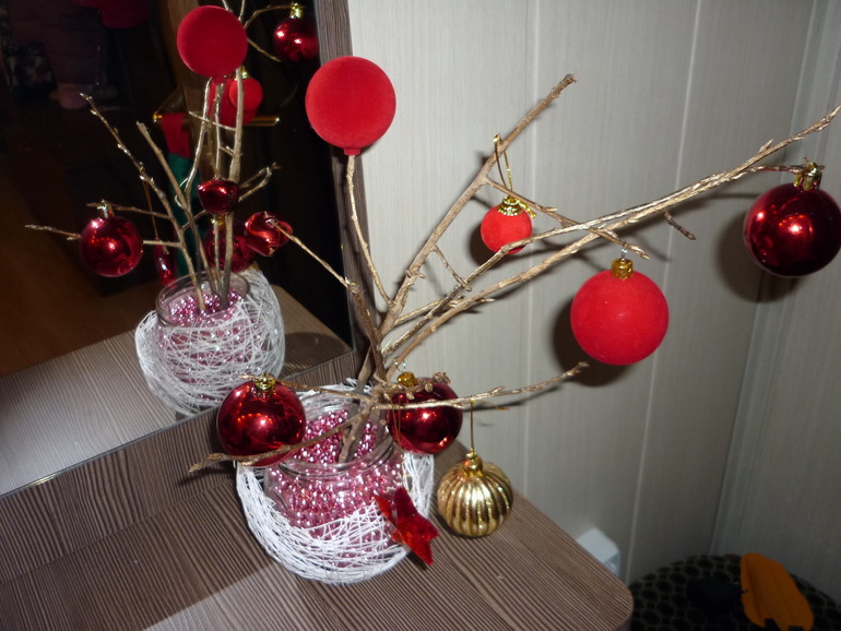 В этом году делала композицию из веток в банках. Очень понравилось. Ветки красила золотой краской. Этот букет стоит в прихожей