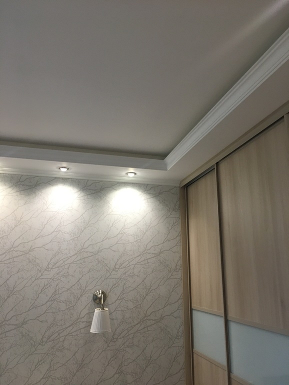 И в спальне тоже потолки два уровня-внутренний утоплен-здесь где пойдёт плинтус-по основному периметру и всё?внутри планируется подсветка.