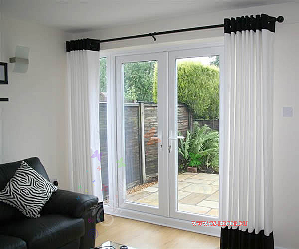 Мы будем делать белые полупрозрачные вот такой конструкции. Длинная на балконную дверь, подвязанная на сторону где окно. Возможно подхваты и верх сделаем непрозрачной тканью другого цвета как на втором фото