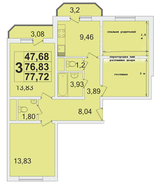 Маленькую комнату отдать дочке или сделать из нее спальню, ну и вторая я комната спальня, со входом напротив су