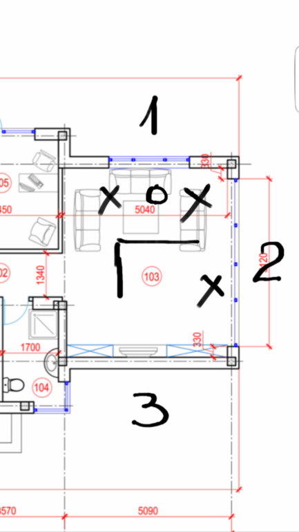 Гостиная 29.1 кв.м. (5040х5780). По стенам 1 и 2 окна в пол. Стена 3 глухая. Мебель скорее всего будет расположена так: угловой диван там, где нарисована большая буква "г", рядом, вдоль стены 2 обозначено крестиком кресло. Позади дивана два крестика - кофейные креселки (или не кофейные?) и малюсенький столик шахматный (обозначен кружочком). Телевизор на стене 3, шкафов или стеллажей по этой стене не будет.