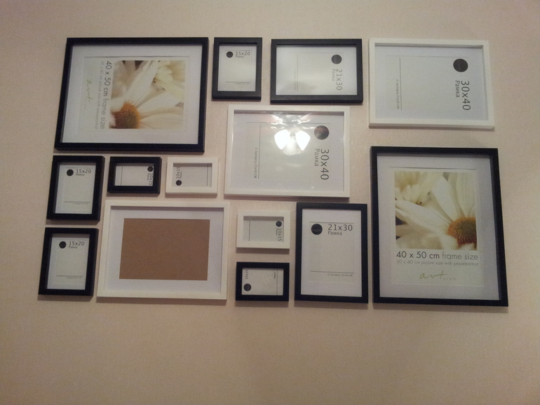 1) Составление панно из фоторамок исходя из пожеланий заказчика и особенностей помещения (десятки возможных композиций)