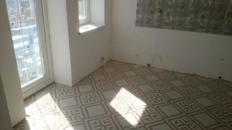 это окра по стене напротив стены без окон. в. Арке видна кухня, но давно, еще без плитки