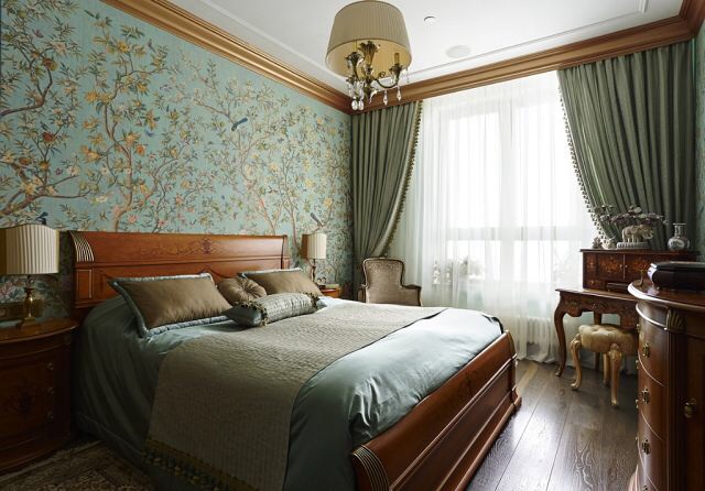 Вот пример реальной спальни с активными обоями. Но тут история была такая: хозяйке очень понравились эти обои и засчет светлого крупного узора, они не давят на человека и не уменьшают пространство, в отличии от темных обоев с мелким золотым рисунком