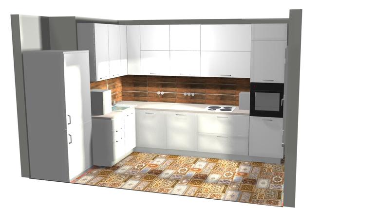 Галина, добрый день! Короб лучше сделать в цвет стены и вплотную к верху шкафов. Холодильник тоже можно обыграть и петли у него должны быть левые. Насчет плитки не уверена, пестровато получается.