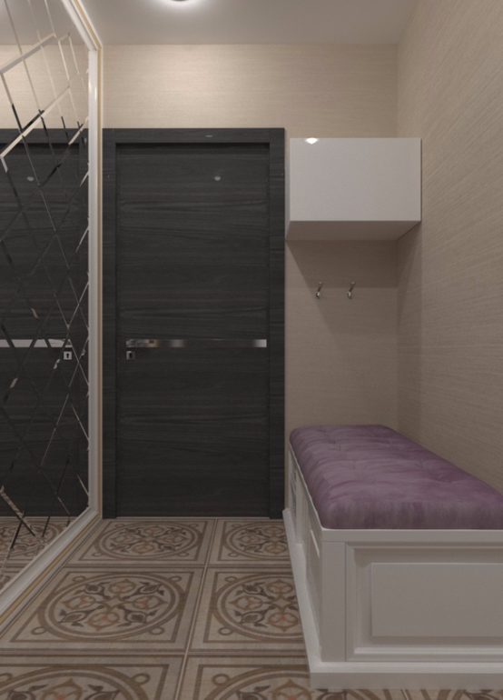 Второй вариант получился благодаря идее Марии использовать двери темно-серого оттенка, и они сюда отлично вписались, вероятно кирпичная стена останется пустой, либо на ней разместится несколько рамок. Над банкеткой по просьбе Марии я разместила небольшой бокс от Икеи