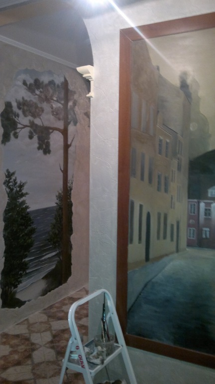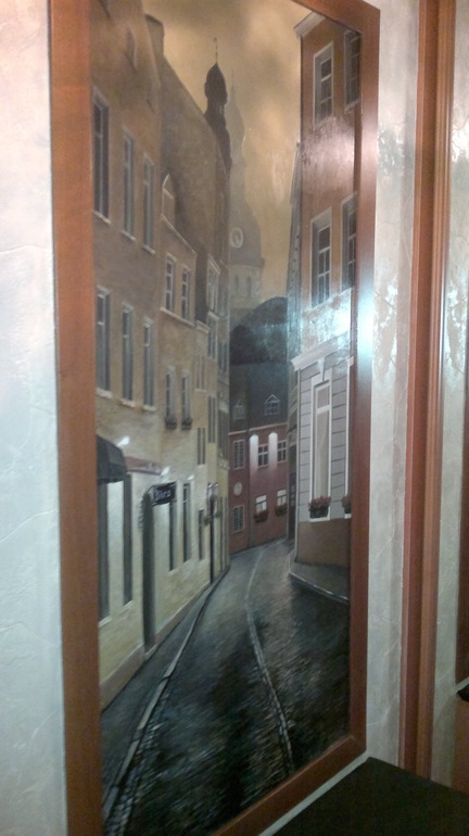 Стену в прихожей решили сделать фальш - окном с видом на ночную улочку Старой Риги, так чтобы в вечернем тумане был виден Домский собор. "Окно" большого формата, почти на всю стену. Далее возле него она поставит банкетку и кованный небольшой цветочник, окно все же)