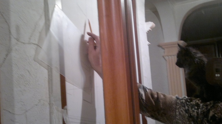 Самостоятельно забирался по ногам и сидел на моей руке, следил за работой карандаша(он же шуршит), путался под ногами(дитё же) и залез за 5 секунд в ведро с краской), отмывали, сушили. В общем было не скучно.