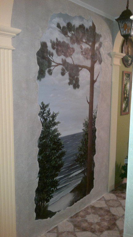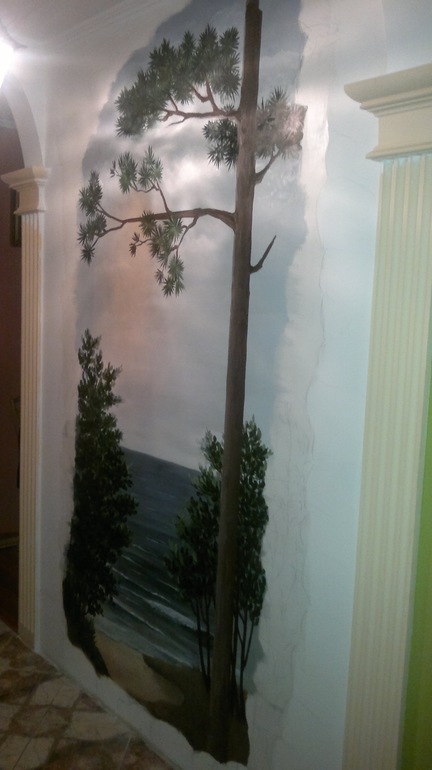 Эта стена в коридоре, напротив санузла. Она очень желала кусочек Балтийского моря, с сосной и песчаным берегом. Интерьер яркий, много цвета, поэтому решили что будет все сдержанно, в пасмурно - серых тонах.
