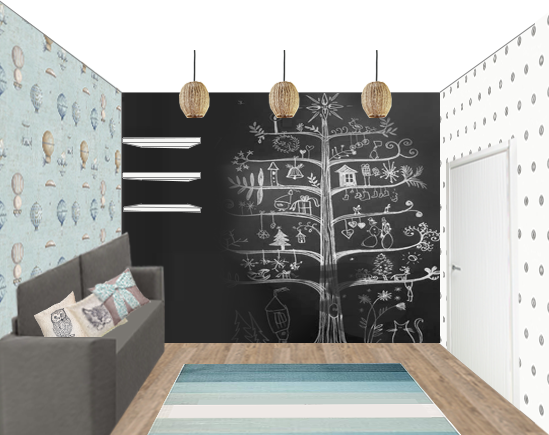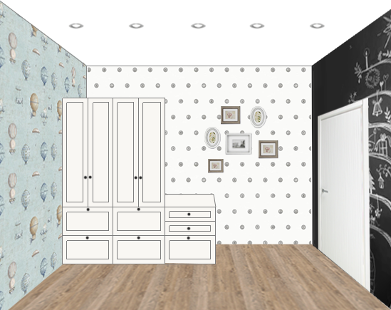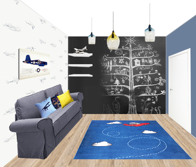 Одна стена чисто грифельная. Обязательно было задействовать в проекте либо дирижабли, либо самолеты. Изначально, белый Икеевский шкаф уже присутствовал в старой квартире и хотелось найти место для него и в новой.