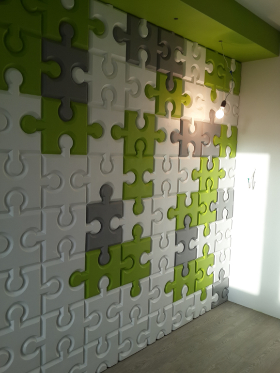 Это панели 3д каждая в форме детали пазла. Они собирались на стене как пазл, перед этим красились каждая отдельно)