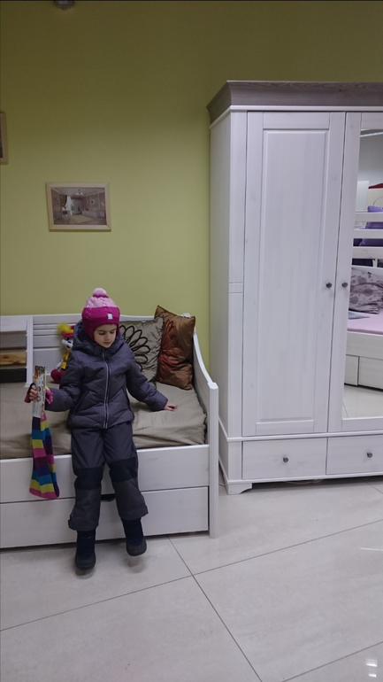 Но такие икеевские кровати слишком огромные для нашей комнаты. Потом мы присмотрели белорусскую мебель,но она вообше громоздкая,даже ребенок не мог на кровать залезть))вот на фото,еле взобралась:
