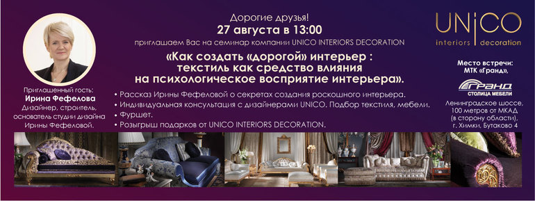 Интерьерные штучки.В субботу, 27 августа, в 13:00 во флагманском салоне интерьеров UNICO, состоится практический мастер-класс дизайнера, руководителя студии дизайна интерьеров, преподавателя Британской Высшей Школы Дизайна, Ирины Фефеловой.