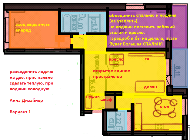 Т.к коридор у нас проходной, то думаем вход на кухню сделать через гостиную. В полученном закутке сделать шкаф для верхней одежды (правда сомневаюсь, удастся ли, т.к. ширина проема 130 см ((), с/у будет гостевой, и там же будет стир.машина.