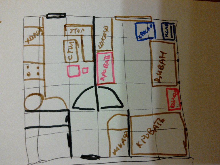 Диваны раскладываем каждый раз, без этого ни как и именно поэтому я мечтаю о кровати в отдельной комнате. Но когда собраны диваны, получается много места, сын носится с собакой. Диван взрослый стоит на месте где у вас кровать розовым, т.е. от входной двери видно стенку и шкаф, детский диван-комнатка скрыта за счет небольшой стены (даже можно не заправлять ))) )врозлый диван как бы со спины.