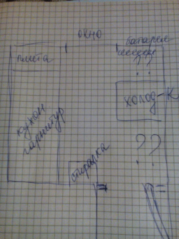 у нас в углу (где у вас плита) холодильник, потом плита и потом гарнитур. Мойка сразу слева от входа. Стол около батареи