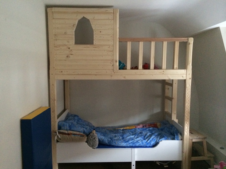 Интерьерное решение детской комнатыБыла обычная икеевская раздвижная кровать. Так как комната маленькая, муж сделал игровую зону над кроватью. Концепция - замок принцессы, балкон и башня. Теперь вопрос как раскрасить. Не хочется много белого, тк белые стены, менять нельзя - дом съемный. Розовый возможен в умеренных количествах, фиолетовый и сиреневый не нравится... Была идея сделать опоры светло серыми, башню пастельно-желтой и нарисовать текстуру камней, как будто она из камня. Балкон белый. Может у кого-то будут интересные идеи или примеры.