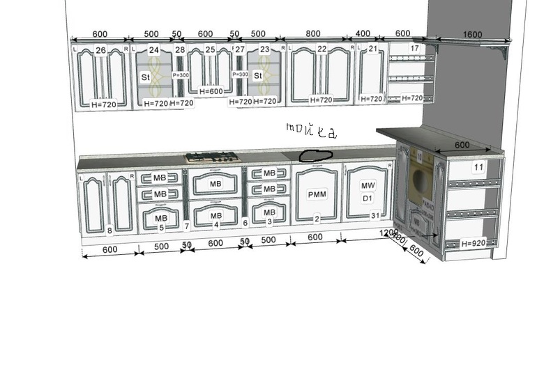 Интерьерное решение кухниХолодильник будет на другой стороне кухни. Меня смущают два больших шкафа по 60мм под мойкой и два больших шкафа с зеркалами по 50. Как они будут смотреться? Не громоздко?