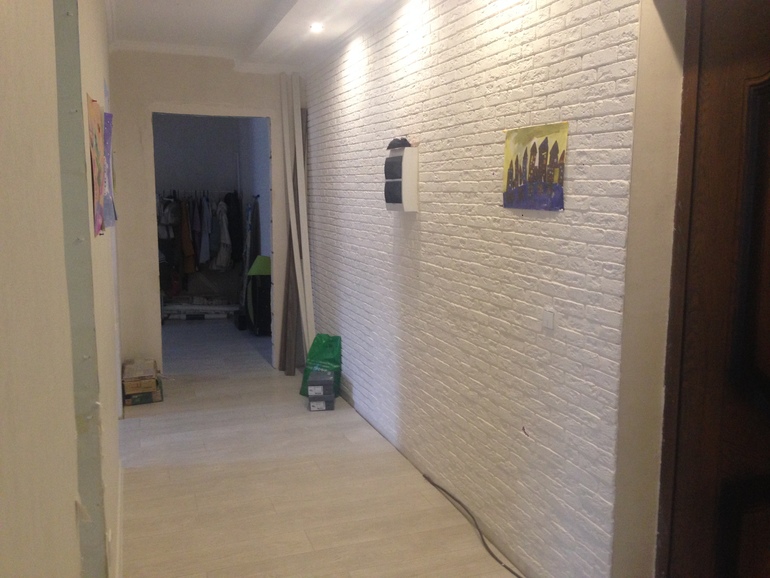 квартира линейная трешка. Решили стену в прихожей заложить клинкером. Полностью мое творение))))) Ещё в процессе, затираю швы, но совершенно растерялась, и не знаю что делать дальше..... Стена сливается с полом и как бы теряется((((( не уютно совершенно.... я конечно понимаю, что дверей нет и обои не поклеены, но все равно не то. Подкиньте пожалуйста идеи, что с этой стеной, да и вообще со всеми стенами можно сделать, чтобы прихожая "заиграла". Принимаются любые идеи!!!!! Ремонт оооочень затянувшийся, голова думать отказывается..... хочется зарядиться какой-нибудь идеей перед праздником))))) И ЕЩЁ! Какие бы поставили двери: светлые или тёмные?