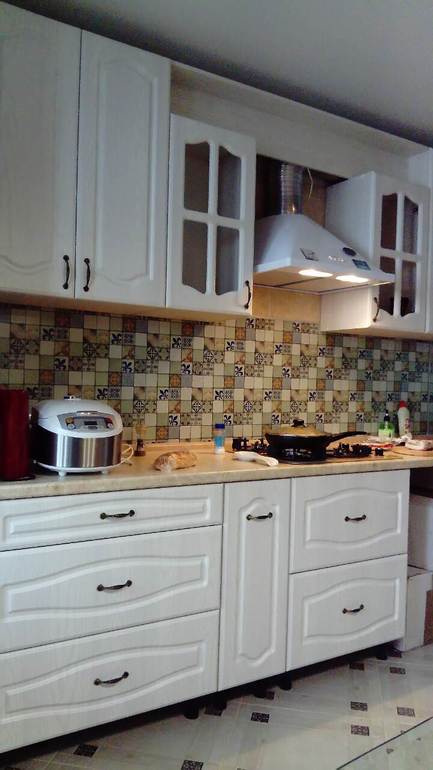 С трубой вытяжки что-то будет еще? Она там, как вставной зуб, простите... так как фон тоже другой, вы не хотели продлевать плитку пэчворк между шкафами?