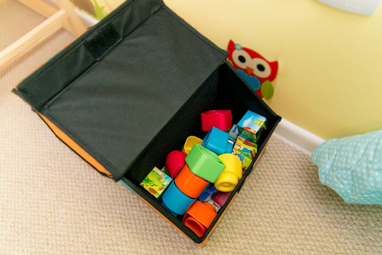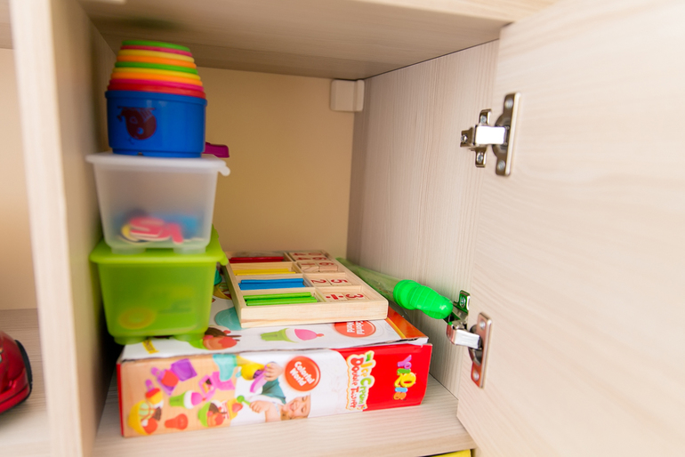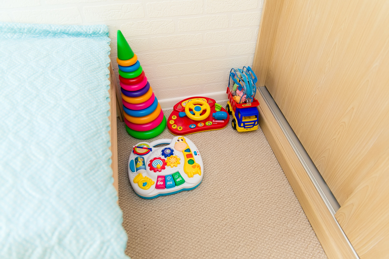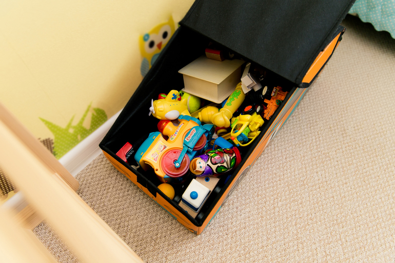 Совсем крупные игрушки храним между кроватью и шкафом, и никому не мешают, и всегда в поле зрения ребенка:
