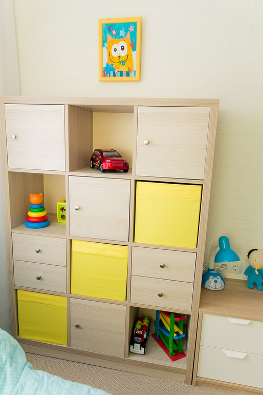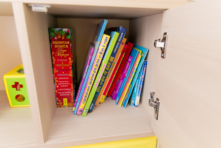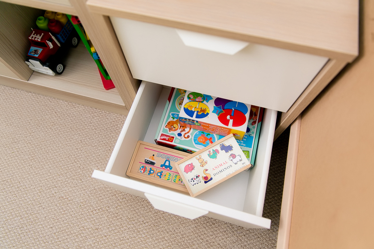 В желтых коробках мы храним "забытые или поднадоевшие" игрушки. Когда ребенку надоедают текущие игрушки, он просит достать эти коробки и с интересом в них копается, отыскивая "новинку" :-) В одном из выдвижных ящиков хранится канцелярия, три остальных пока пустуют. За двумя дверками поселились высокие книги, малыш сам может достать: