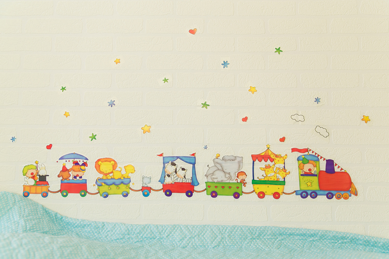 Над кроватью наклеила еще заказанный во время беременности паровоз, теперь каждое укладывание спать сопровождается звонким "Ту-тууу" в исполнении сына :-) Рассматривает зверят, считает колеса. В общем, пока пьет молочко, есть куда посмотреть и чем заняться :-)