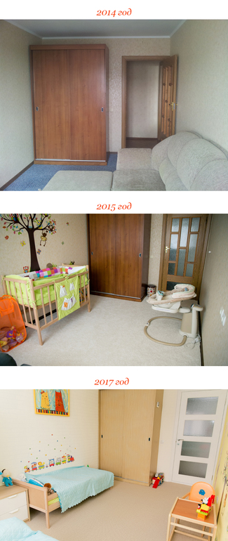 Шкаф-купе остался в квартире от прошлых хозяев. Мы его несколько раз "апгрейдили" - дозаказывали ящики внутрь, добавляли полку, а сейчас добавили дополнительную штангу, все равно детская одежда коротенькая, так что места стало вдвое больше, и шкаф у нас полупустой стоит. В итоге он такой идеальный для нас получился, что менять и смысла не было :-) Правда цвет... цвет "орех" вообще не вписывался в комнату. Несмотря на протесты мужа, мы все-таки оклеили его пленкой-самоклейкой. Сначала я проводила опыты на кусочке ДСП, поняла, как обращаться с пленкой, чтобы все аккуратно получилось, без пузырей, поняла, как ведет себя пленка на ДСП. Так что часа 4 времени в четыре руки - и вуаля, новый шкаф готов :-) Моя мама таки подумала, что мы новый заказали, насколько он аккуратным получился. И муж по итогу остался доволен результатом. Каким был шкаф раньше, можно увидеть на фотографии ниже, собственно, как и "эволюцию" комнаты :-)