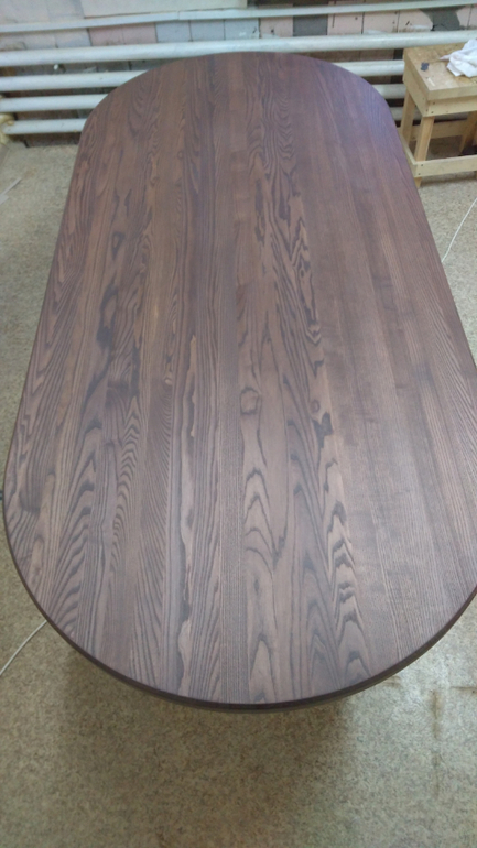 Столешницу попросили сделать овальной. Вот что получилось: размер столешницы 2000*900мм, толщина 40 мм, массив ясеня.