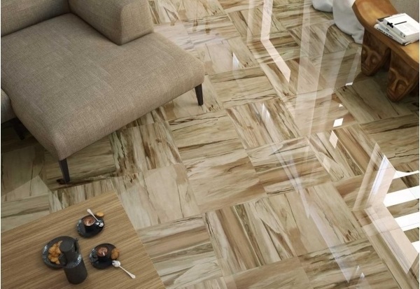 Мне нравится когда напольное покрытие сочитается со столешницей. Я бы выбрала керамогранит под дерево.