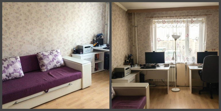 Есть гостиная с двумя рабочими местами без косметического ремонта. Но обойчики уже закуплены, будет так: