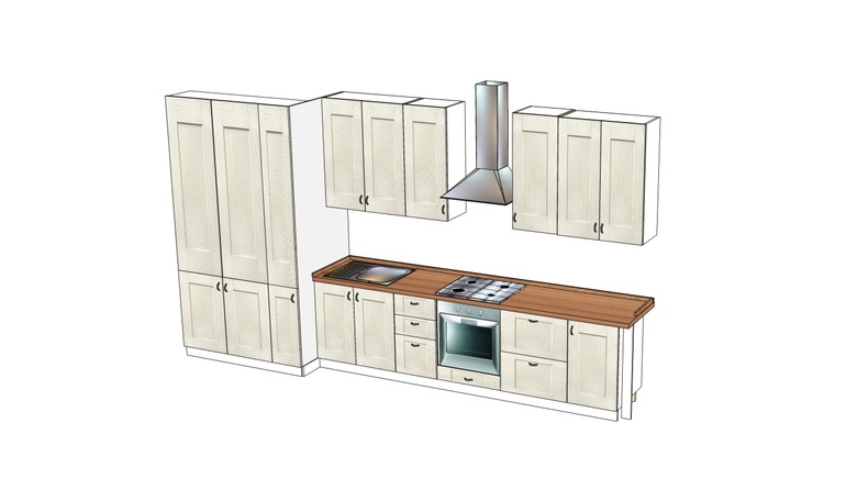 Т.е. никаких скошенных углов, открытых полок, стекла и т.д. Мойку перенесли. Будет нержавейка большая с крылом, т.к. от посудомойки я отказалась в пользу ящиков. Жалко, никуда не получилось придумать колонну - хотела духовой шкаф в колонну. Ну и холодос придется ставить отдельный, а не встроенный. Но это самый лучший вариант с нашим котлом. Всё, как я хотела. Это , конечно, не точная копия моей будущей кухни, просто набросок как примерно всё это будет выглядеть. Ручки будут не такие - внизу будут икеевские небольшие рейлинги, а вверху на дверцах шкафа с котлом - маленькие круглые ручки. Цвет кухни - белый, форма фасадов - такая же. Не будет уголка-плинтуса по периметру столешницы - мне не нравится, но, говорят, что не практично без плинтуса.