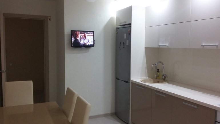 Спасибо. Наша кухня 13 квадратов. А вдоль стены уже не получится так как стол довольно большой, и будет уж слишком по середине. А вы как думаете какого цвета лучше присматривать, молочного или потемнее, как низ фасадов кухни