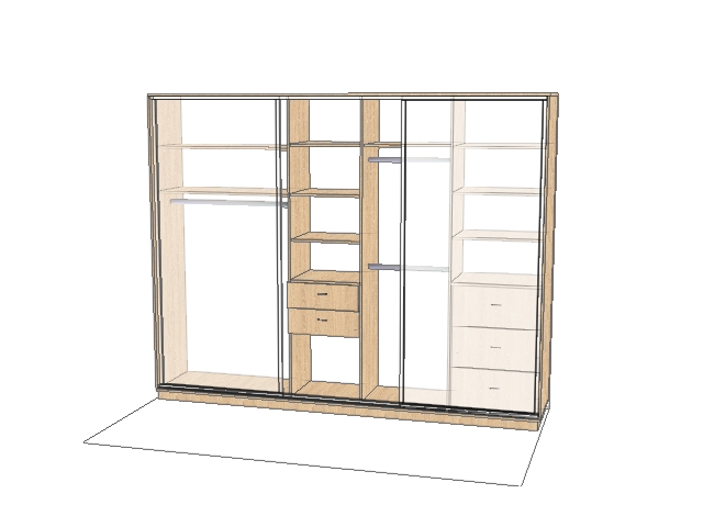 У меня шкаф 4 двери по 90 см, все выдвижные ящики находятся в одной секции, она немного уже остальных и за счет этого все хорошо открывается. Первый отдел как у вас на рисунке, во втором часть ящики от пола и пара полок, затем опять две штанги, в последнем просто полки. Мне очень удобно. Я специально заказывала много штанг, так как люблю все развешивать)