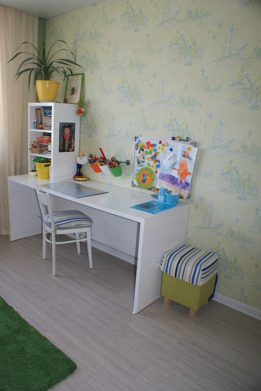 Стол хотела длинный, чтобы можно было заниматься вместе, для этого я и сделала себе пуф. Скоро поменяем стул на кресло, регулируемое по высоте