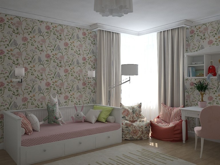 Мы с дочерью 8 лет сначала отсмотрели сотни фотографий чтобы понять какой стиль в комнате ей нравится, с цветом стен у нее не было сомнений, а потом я ей предложила обои под покраску выбирать из 10 примерно вариантов.