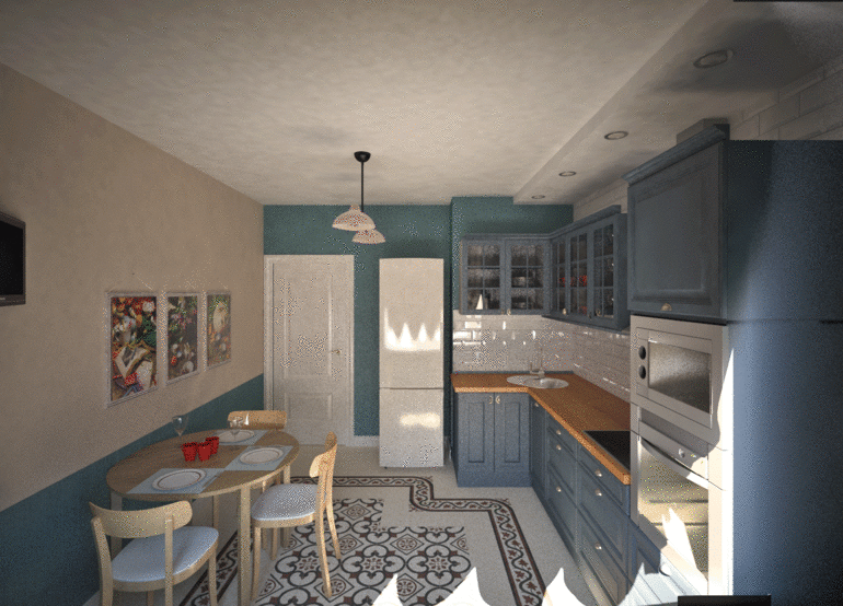 Мне полоса на пол стены сразу какую-то столовую напомнила. И слишком яркая бирюзовая стена, ругается с синей кухней. И раскладка плитки на полу странная. И стол я бы подобрала в цвет столешницы, или столешницу не такую желтую выбрала