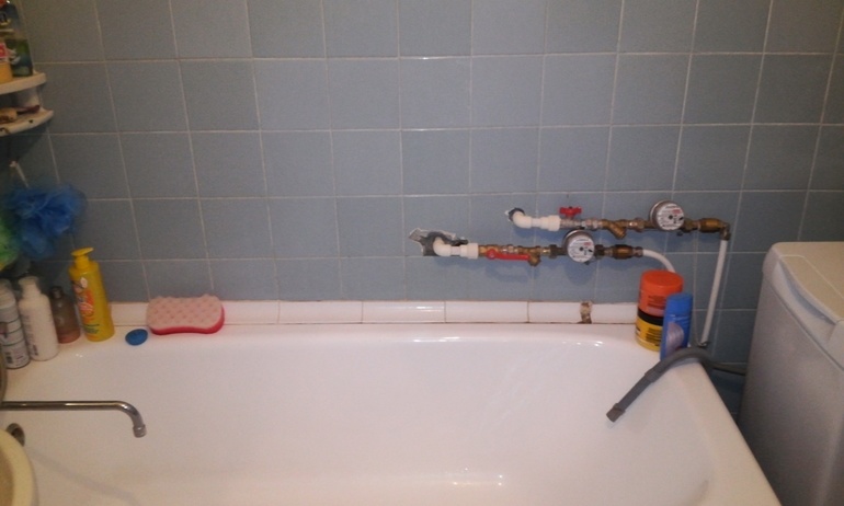 П,С, забыла поделиться главным геморроем нашей ванной, фото доремонтные) Вот как оригинально к нам в квартиру заходит вода)))))) Вот прям так, посреди стены)