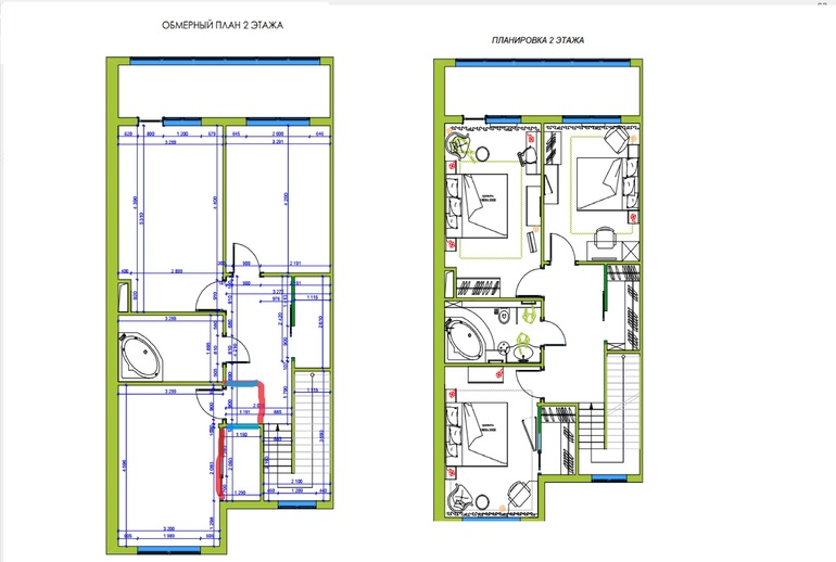 На втором этаже красным также ставим новые стены, чтобы вход в гардеробную был при входе в комнату.