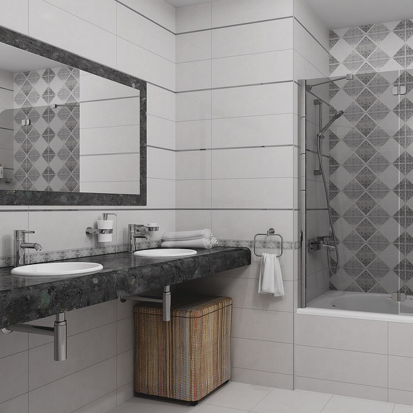 У нас практически всё куплено: смесители, душевая система, раковина, сифон (могу сфотографировать попозже). С плиткой вроде бы определились: студио серая, как на фото, только без серых тонких полосок.