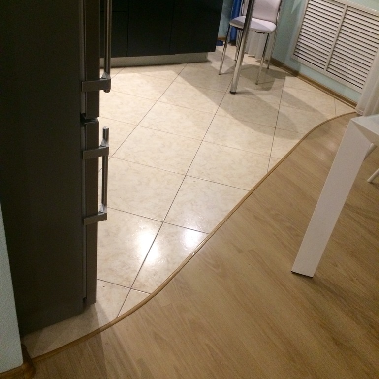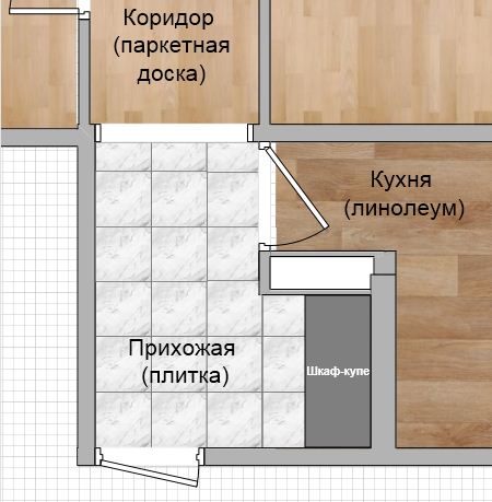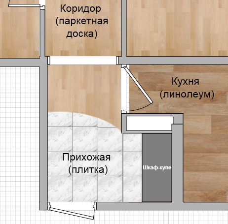Это предложение мужа - сделать какой-то полукруг, который плавно перетечет из одного покрытия в другое. Возможно, полукруг прямо от арки до угла в прихожей со шкафом...