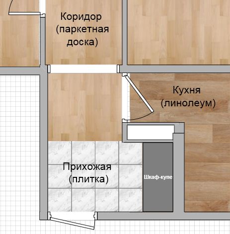 Во всей квартире будет паркетная доска, на кухне толстый линолеум, в прихожей будет плитка. Паркетная доска и линолеум уже куплены, обои и входная дверь тоже, плитка еще нет, но я предполагаю какую-то в серых тонах.